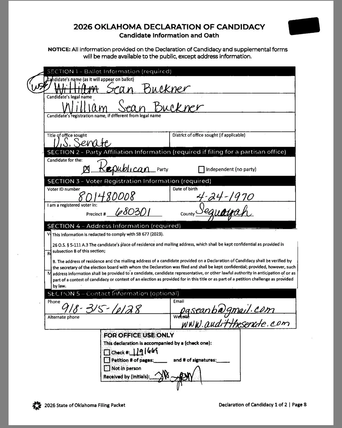 On his 2026 Oklahoma Declaration of Candidacy — the official document filed with the State of Oklahoma to place his name on the Republican primary ballot for United States Senate — William Sean Buckner listed his contact email address as pgseanb@gmail.com.