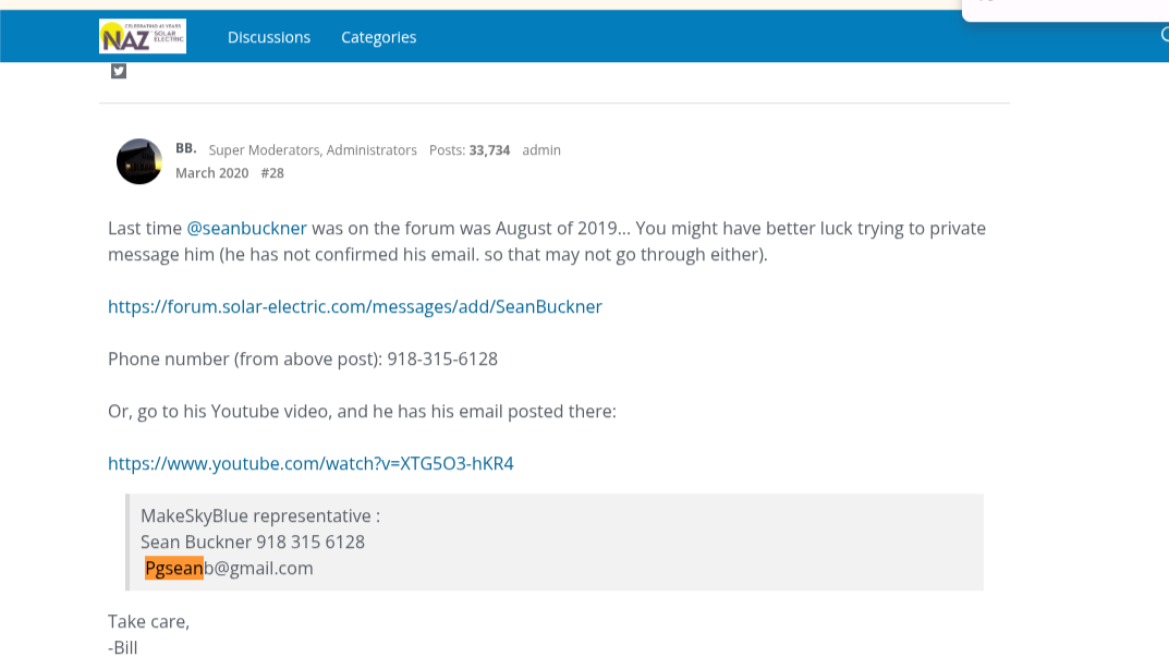 Later in the same thread a forum administrator and super moderator named BB — a user with 33,734 posts and administrator-level access on the solar-electric.com platform — posted Sean Buckner's contact information directly in response to a forum user who was trying to reach him about a product issue. The administrator posted the following: